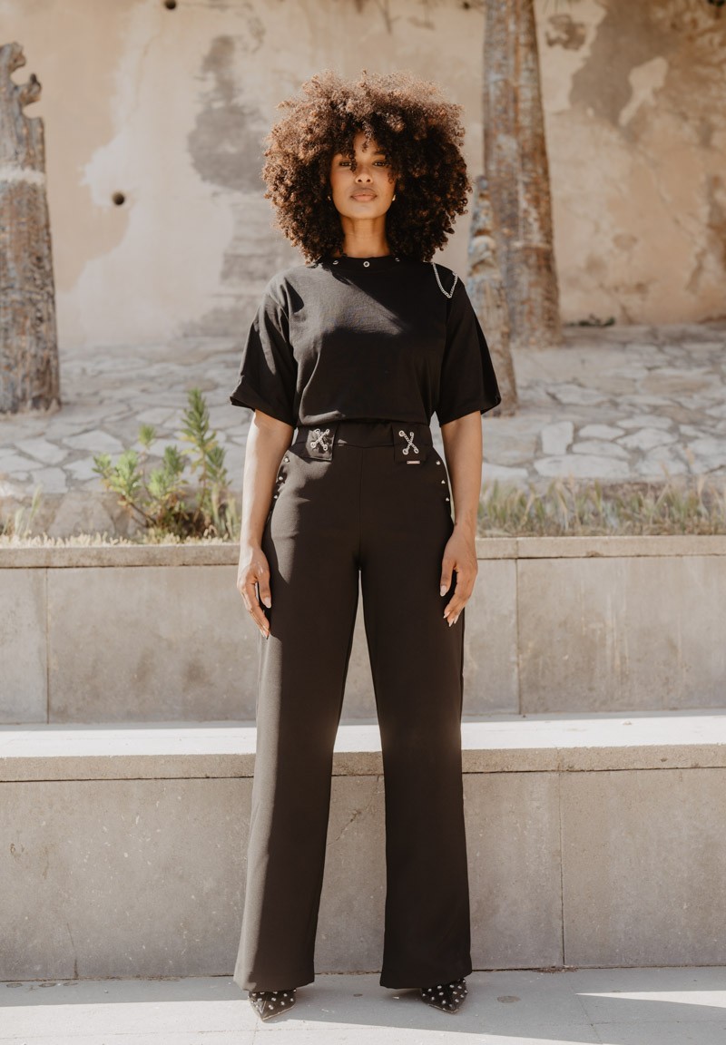 Pantalón de corte recto, con goma en la cintura. Lleva bolsillos decorados por tachuelas, y unas trabillas anchas decoradas con ollaos y cadenas cruzadas. Puedes llevarlo a conjunto con la chaqueta de esta misma línea.