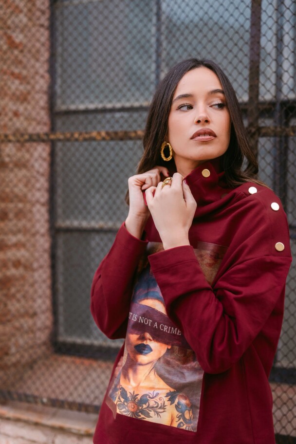 Vestido tipo jersey de punto tricotado es 100% algodón de primera calidad, con una ilustración muy Aire Retro que mezcla rock, actitud y rebeldía en cada puntada.