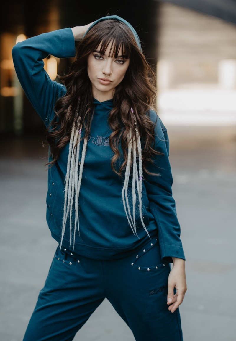 Pantalón tipo jogger. Cintura con goma. Bolsillos enmarcados por tachuelas. En uno de ellos, bordamos la palabra Animosa con una tipografía estilo punk.